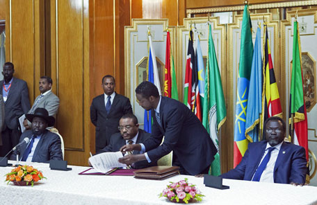 Ethiopian Prime Minister Hailemariam Desalegn (C) signing the Cessation of Hostilities treaty over the war in South Sudan, alongside Salva Kiir (L), President of South Sudan, and Riek Machar (R), SPLM Opposition leader, in Addis Ababa. After thirteen months of war and six failed ceasefires, diplomats are being forced to accept that any deal to end the war in South Sudan will, at best, result in a return to the status quo that precipitated the carnage in the first place. (AFP)