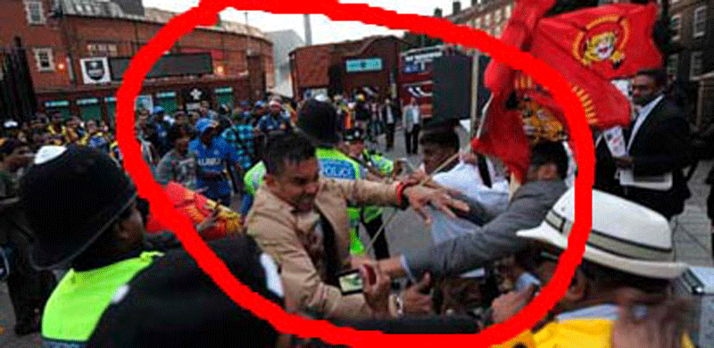 Sri Lankan cricket fans and Tamil protesters clash outside Oval grounds in England. (Picture courtesy Lanka Mirror)