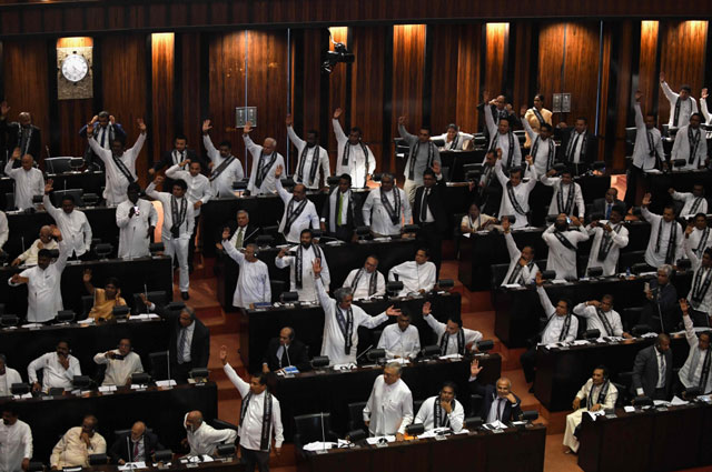 Sri Lanka’s Parliament has passed a no-confidence vote against the government headed by Mahinda Rajapaksa, a former strongman hastily sworn in as prime minister last month.