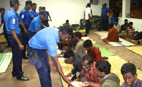 Sri Lankan sailors assist rescued survivors at Oluvil fisheries harbour in eastern Sri Lanka on February 3, 2013. Sri Lanka's navy on Sunday rescued all 138 Bangladeshi and Myanmar survivors from a sinking fishing vessel off the island's eastern coast, officials said. (AFP)