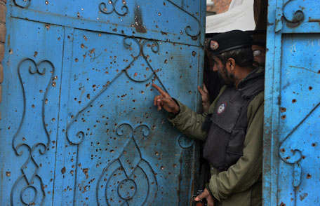 A Pakistani police officer looks a shrapnel-riddled gate caused by a suicide bombing on the outskirts of Peshawar, Pakistan, Monday, Feb. 10, 2014. A suicide bomber blew himself up in the house of a pro-government tribal elder in the northwestern Pakistani city of Peshawar on Monday, police said. (AP)