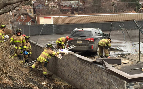 Authorities say a motorist drove his SUV off a road, crashed through a fence and landed on the roof of a Pittsburgh supermarket.