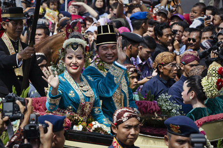 Crowds wave to Sultan Hamengkubuwono X while on his journey by carriage during the wedding ceremony parade as part of the Royal Wedding Held For Sultan Hamengkubuwono X's Daughter Gusti Ratu Kanjeng Hayu And KPH Notonegoro in Yogyakarta, Indonesia. (Photo by Getty Images)