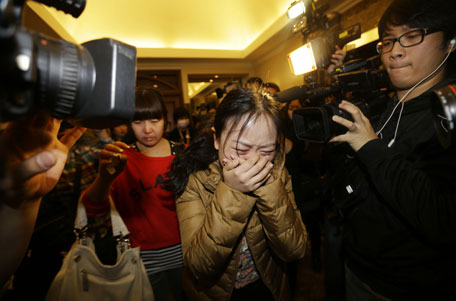 A relative (front) of a passenger of Malaysia Airlines flight MH370 cries as she walks past journalists at a hotel in Beijing March 9, 2014. The Malaysia Airlines Boeing 777-200ER aircraft carrying 227 passengers and 12 crew was presumed to have crashed off the Vietnamese coast on Saturday, and European officials said two people on board were using false identities. (REUTERS)