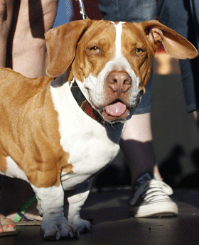 Tammie Barbee walks her dog Walle, a Beagle-Bassett, down the red carpet at the start of this year's World's Ugliest Dog competition in Petaluma, California, on Friday, June 21, 2013. (AFP)