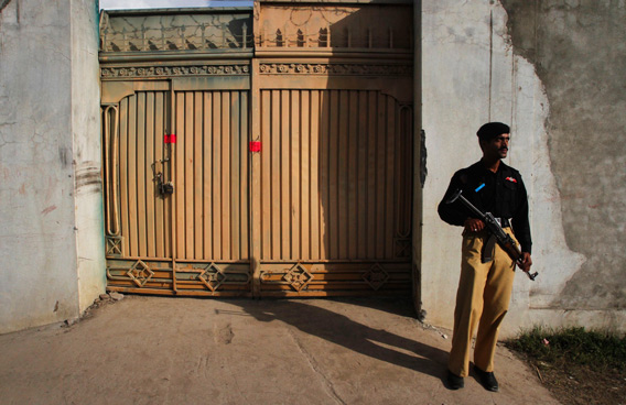 A policeman keeps guard outside the gates of the compound where al Qaeda leader Osama bin Laden was reported to have been killed in Abbottabad May 4, 2011. Bin Laden was unarmed when US special forces shot and killed him, the White House said, as it tried to establish whether its ally Pakistan had helped the al Qaeda leader elude a worldwide manhunt. (REUTERS)