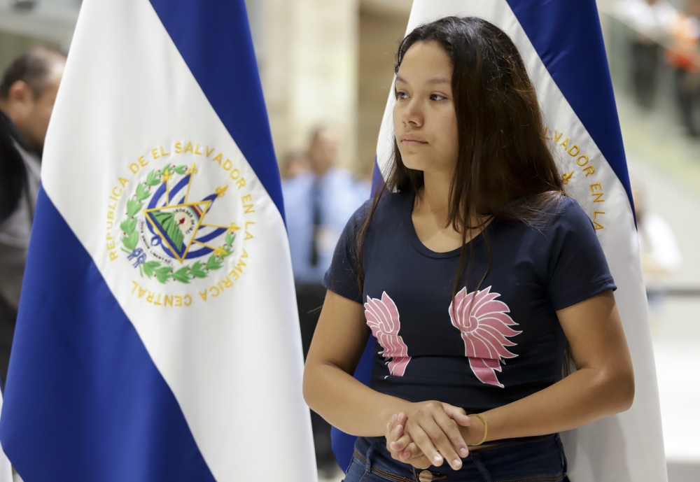 Tania Vanessa Avalos stands nearby as a government official speaks at a press conference at the airport, after her arrival in San Salvador, El Salvador. (AP)