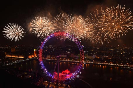 Fireworks explode around the London Eye during the New Year celebrations in central London just after midnight on January 1, 2015. AFP
