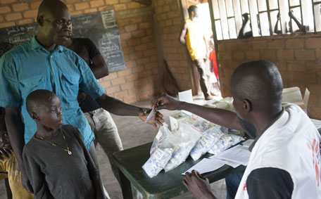 A picture taken on July 24, 2014 shows a nurse giving medicine to a father to treat the malaria of his child in a hospital near Bambari. European regulators on July 24, 2015 gave the go-ahead for the world's most advanced malaria candidate vaccine, despite mixed results from a years-long trial on nearly 15,500 children in seven African countries. (AFP)