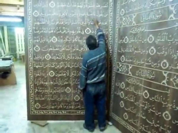 He said he was using large wood boards produced at the carpentry to engrave the Quran words, adding that he needs nearly a week to finish one page.