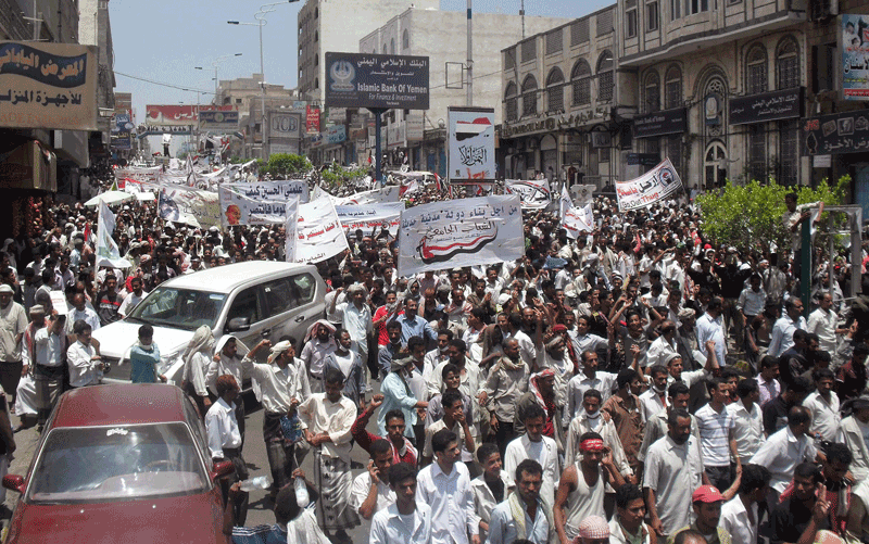 Yemenis protest against President Ali Abdullah Saleh in Taiz (Taez), the second most-populated city of Yemen, south of Sanaa as foreign ministers of the six-nation Gulf Cooperation Council hope to finalise in the coming days a transition plan to end months of deadly political unrest in Yemen. (AFP)