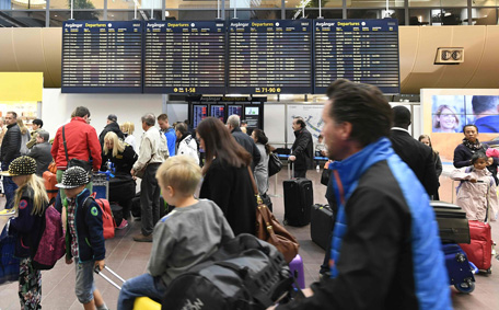 Passengers wait for flight information at Arlanda Airport on June 11, 2016 in Sigtuna near Stockholm. Some 400 Swedish SAS pilots walked off the job on Friday in a dispute over wages and working conditions, stranding 4,000 passengers, the Scandinavian carrier said. "The Swedish pilots union has called 400 members on short-haul flights out on strike. Both domestic and European flights from Sweden are cancelled," the company said in a statement. (AFP)