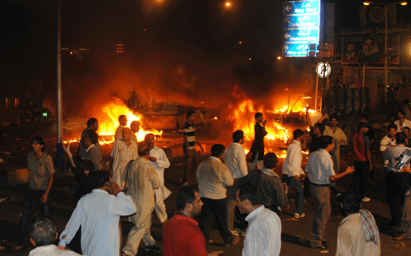Vehicles burn after protestors reacted to bomb blasts that targeted a Shia Muslim procession in Lahore, Pakistan, on Wednesday. (GETTY IMAGES)