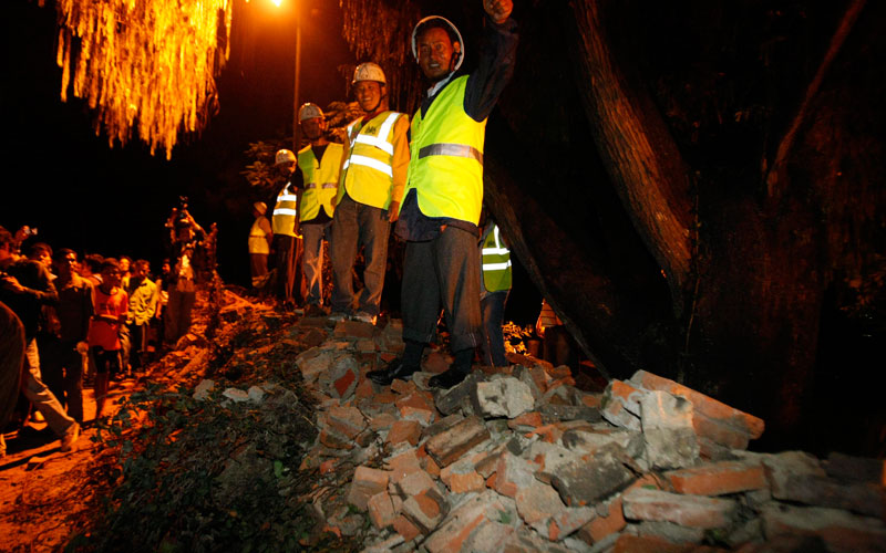 Nepalese rescue workers and people look on after after the British Embassy's compound wall collapsed reportedly killing three pedestrians following an earthquake in Katmandu, Nepal. A strong earthquake with a preliminary magnitude of 6.8 hit northeastern India on Sunday near the border with Nepal. Reports said several people were injured and some buildings fell in the capital of India's Sikkim state. In neighboring Nepal and Bangladesh, the quake sent residents rushing out their homes, offices and shopping centers. (AP)