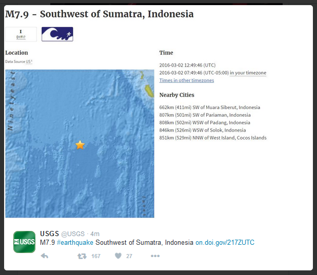 An earthquake of magnitude 7.9 that struck off Indonesia's island of Sumatra on Wednesday killed some people, but it was not yet clear how many, an official of the country's search and rescue agency told Reuters.