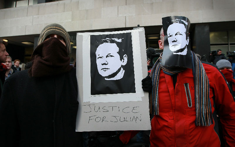 A supporter of Julian Assange holds a placard outside as another wears a mask outside Westminster Magistrates Court in London. (GETTY IMAGES)