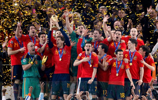 Spain's soccer team celebrates with the World Cup trophy after their final match victory over Netherlands, during the award ceremony at Soccer City stadium in Johannesburg. (REUTERS)