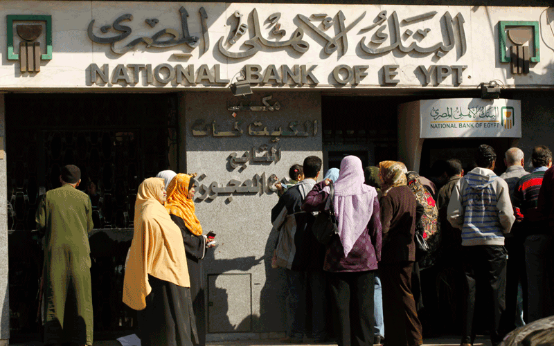 Egyptians wait at an automatic cash dispenser in Cairo, Egypt. Egypt's economy suffered a fresh blow after yet another credit agency lowered its ratings and its currency approached a five-year low with slim chance of a quick rebound amid surging street protests. (AP)