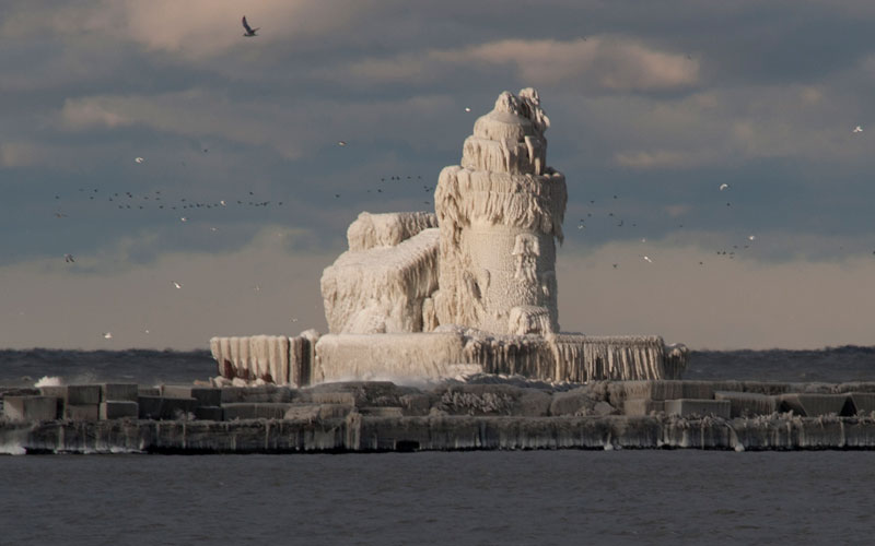 This image provided by the U.S. Coast Guard shows a small break in the clouds overhead allowing sunlight to momentarily illuminate the ice-covered Cleveland Harbor West Pierhead Lighthouse Tuesday Dec. 14, 2010. High winds and subzero air temperatures caused waves to crash onto the lighthouse and other aids to navigation and freeze, coating the structures and their lights in multiple layers of ice and making it impossible for mariners to see the lights or distinguish the color of the aids. (AP)
