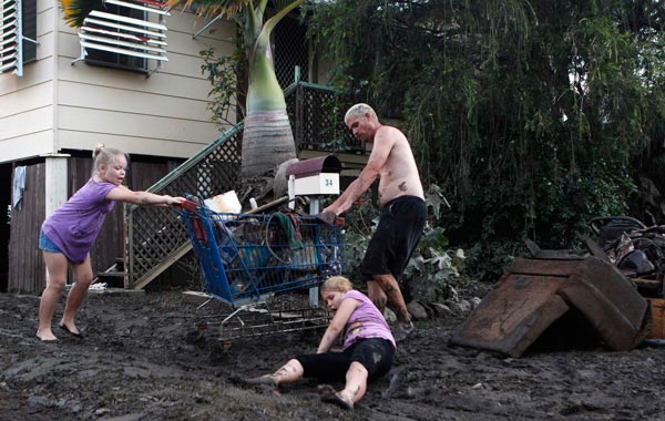 A girl falls in the mud as her sister and father remove damaged belongings from their home affected by floodwater in Bundaberg, Queensland. (REUTERS)
