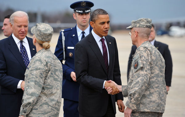 US President Barack Obama(C), and Vice President Joe Biden take part in a ceremony to mark the return of the US Forces - Iraq colors December 20, 2011 at Andrews Air Force Base in Maryland. The event marks the end of the Iraq war after the last US combat troops rolled out of Iraq into Kuwait on December 18. (AFP)