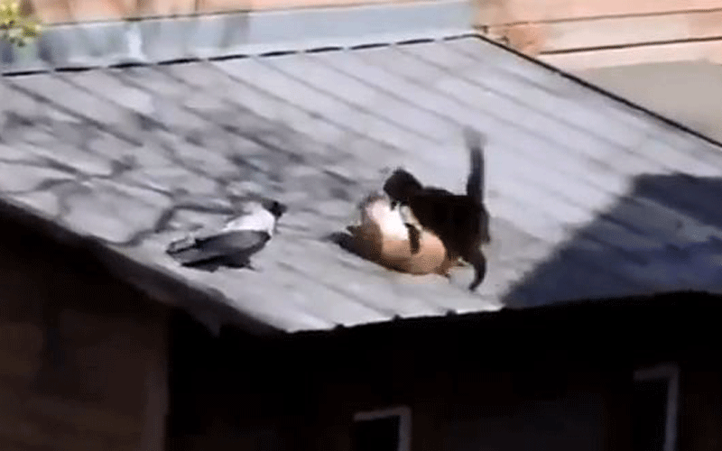 The crow made the two cats fight by teasing them. It’s a really bold crow, subduing the two cats.