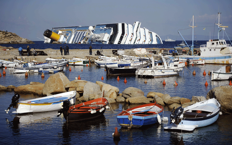 Small boats are docked at the Giglio harbour behind the Costa Concordia, after the cruise ship ran aground and keeled over off the Isola del Giglio, late on January 13. Three people died and several were missing after the ship with more than 4,000 people on board ran aground sparking chaos as passengers scrambled to get off. Two South Korean honeymooners were rescued early today from the cruise as emergency crews searching for dozens missing. (AFP)