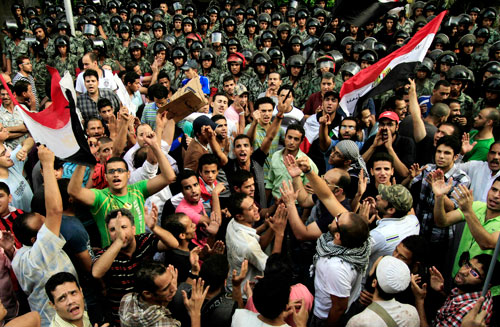 "Sinai, Sinai," the crowds shouted in reference to the Sinai peninsula where the Egyptian policemen were killed and, "Down with Israel. The people want the ambassador out and the Israeli flag down."
