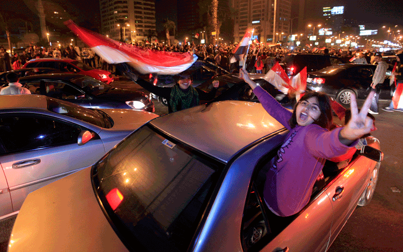 Young Egyptian woman celebrate after President Hosni Mubarak resigned and handed power to the military in Cairo, Egypt. Egypt exploded with joy, tears, and relief after pro-democracy protesters brought down President Hosni Mubarak with a momentous march on his palaces and state TV. Mubarak, who until the end seemed unable to grasp the depth of resentment over his three decades of authoritarian rule, finally resigned Friday and handed power to the military. (AP)