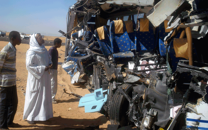 Egyptian men observe the remains of a tour bus that crashed into a truck on the 115 mile (185 kilometer) journey from Aswan to the ancient temples of Abu Simbel, near Aswan in Egypt. The tour bus slammed into a truck in southern Egypt on Sunday, killing eight American tourists and injuring 21 others in the latest fatal crash involving tourists, according to the state news agency. (AP)