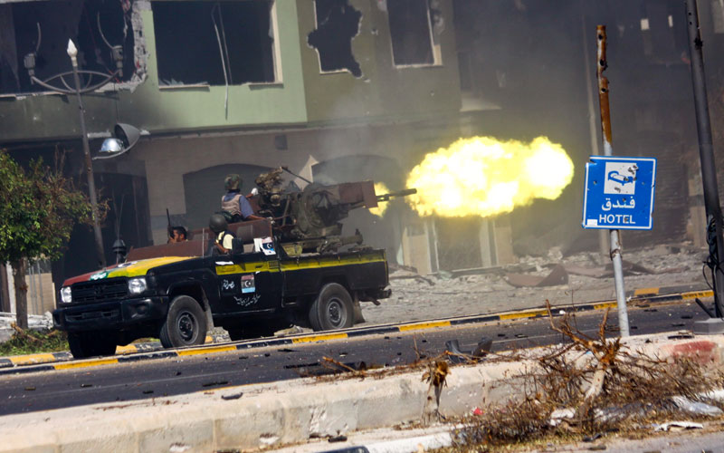 In this photo released by China's Xinhua News Agency, fighters of Libya's ruling National Transitional Council (NTC) fire at pro-Gadhafi forces during heavy battles at the entrance of Al-Etha'a street, about 7 kilometers (4 miles) from the heart of Sirte, Libya. With Nato jets roaring overhead, Libya's revolutionary forces have been fighting their way into Moammar Gadhafi's hometown in the first significant push into the stubborn stronghold in about a week. (AP)