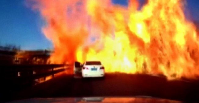 Dashcam footage from a passing car shows a blue sedan bursting into flames just moments after the driver pulled onto the shoulder behind the tanker truck.