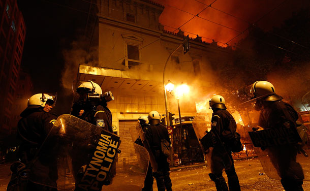 Cinemas, cafes, shops and banks were set ablaze in central Athens and black-masked protesters fought riot police outside parliament before lawmakers voted on the package that demands deep pay, pension and job cuts -- the price of a 130 billion euro ($172 bn, Dh632.5bn) bailout needed to keep the country afloat.