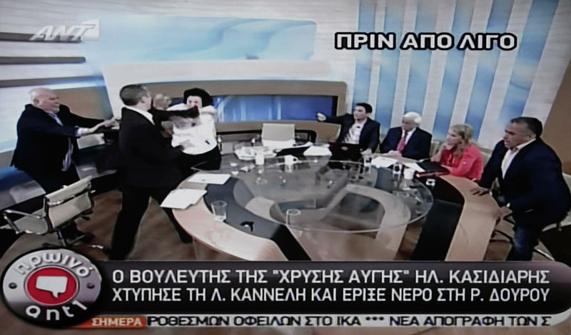 Talk show host Giorgos Papadakis — shouting "no, no, no!" — ran over to Kasidiaris, attempting to calm him down. But a furious Kasidiaris turned on Kanelli, who had gotten out of her chair and appeared to throw a newspaper at the Golden Dawn member.