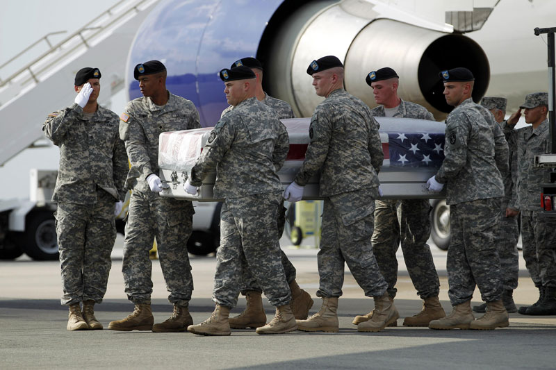 An Army carry team carries the transfer case containing the remains of Army 1st Sgt. Russell R. Bell of Tyler, Texas, upon arrival at Dover Air Force Base, Delaware, on Saturday, August 4. The Department of Defence announced the death of Bell who was supporting Operation Enduring Freedom in Afghanistan. (AP)