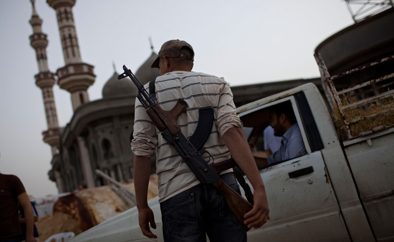A Libyan rebel fighter patrols a check point in the battered city of Misrata, Libya. (AP)
