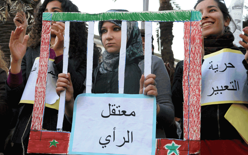 Moroccan demonstrators hold banners during a protest in front of the Moroccan Parliament in Rabat, to demand political reforms and a new constitution following the initiative of the 'February 20' movement. Four thousands of young Moroccans have joined the "February 20" movement on the social networking site Facebook, calling for peaceful demonstrations demanding a new constitution limiting the king's powers and more social justice. The banner read ( L-R) : 'Democracy', 'Opinion Prisoner','Freedom of expression'. (AFP)
