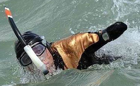"He's in the water now and feeling very good," his spokesman Robert Iseni, who is travelling on the support vessel, told AFP.