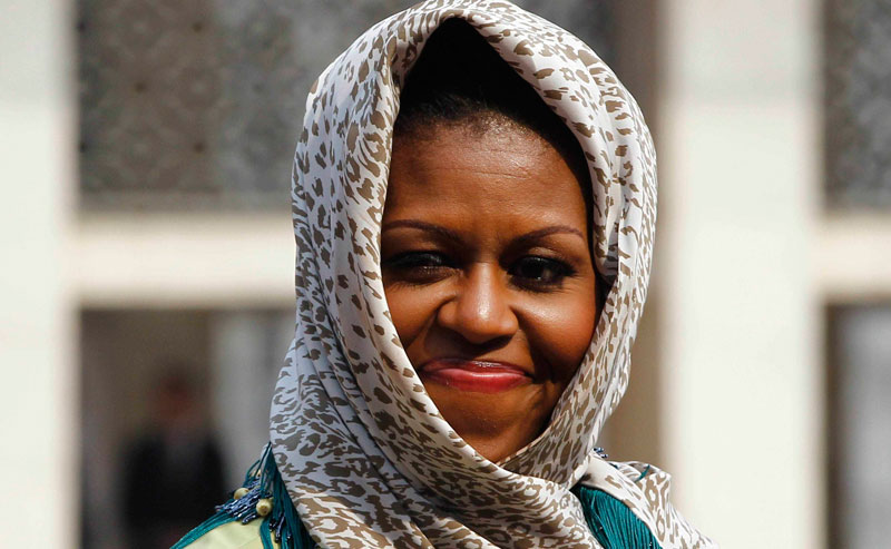 US first lady Michelle Obama donned a headscarf on a visit to an mosque in Indonesia on Wednesday, not a requirement for a non-Muslim but a sign of the Obamas' efforts to show respect for the Islamic world.