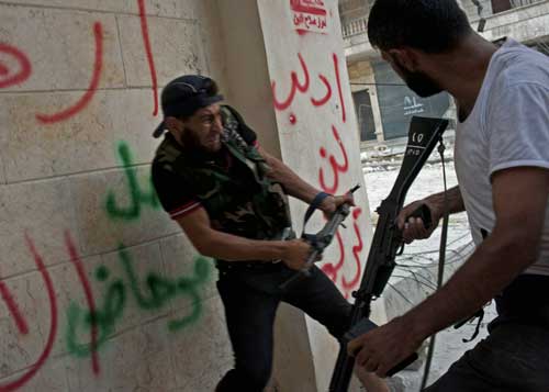 Free Syrian Army fighters take cover as they exchange fire with regime forces in the Salaheddin neighbourhood of Syria's northern city of Aleppo on August 22, 2012. At least 12 people were killed in a raid on a district of Damascus, while fighter jets and artillery pummelled the city of Aleppo and rebels claimed seizing parts of a town on the Iraqi border, a watchdog said (AFP)