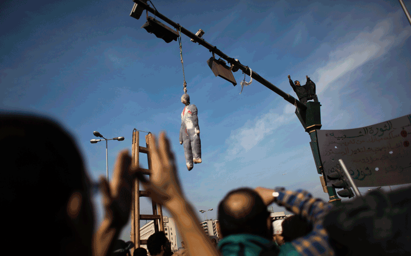 "Choose Mubarak regime or Egypt people," read one sign in English as protesters nearby carry Mubarak's mock coffin shoulder-high. Elsewhere on the square people chant slogans against Mubarak's wife, Suzanne.