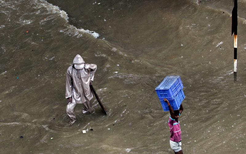 Vendors walk past a water-logged street during heavy rains in Mumbai, India. (AP)