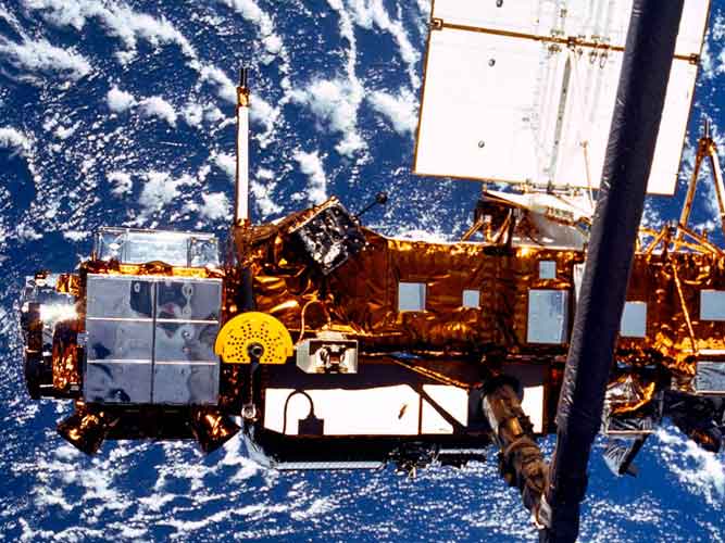 The UARS is deployed by the Space Shuttle Discovery (STS-48) in this Nasa handout photo dated September 1991. The six-tonne Nasa science satellite plunged to earth early on Saturday, but where any debris ended up was not immediately clear. Re-entry was expected between 11.45pm EDT Friday and 12.45am on Saturday (REUTERS) (0345 to 0445 GMT), Nasa said.