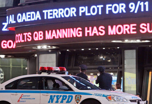 A police officer stands guard in New York's Times Square as the ABC news ticker displays news of an al-Qaida terror threat, Friday, Sept. 9, 2011. Just days before the 10th anniversary of the Sept. 11 attacks, U.S. counterterrorism officials are chasing a credible but unconfirmed al-Qaida threat to use a car bomb on bridges or tunnels in New York City or Washington. It is the first "active plot" timed to coincide with the somber commemoration of the terror group's 9/11 attacks a decade ago that killed nearly 3,000 people. (AP)