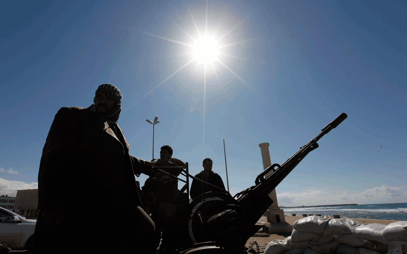 Anti-Libyan Leader Moammar Ghadafi gunmen stand on alert next to an anti-air craft machine gun, as they watch the cost in case any Libyan navy attack. (AP)