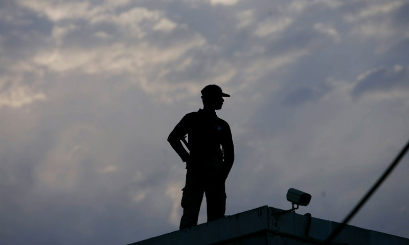 A Pakistani police officer stands guard on the rooftop of the shrine of Sufi Data Ganj Baksh,which was attacked by suicide bombers on in Lahore, Pakistan. Pakistan's prime minister agreed to hold a national conference on ways to combat terrorism after the main opposition leader said the government should negotiate with the country's Taliban militants to improve security. (AP)