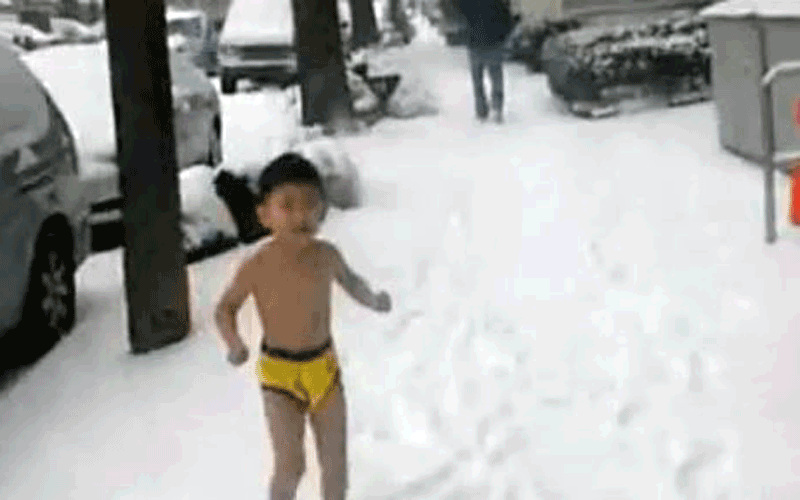 In the video, the little boy runs towards his father, who is filming him, in thick snow with only his shoes and underpants on, at times crying and pleading with his dad to take him in his arms.