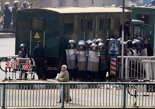 An elderly Egyptian man walks past anti-riot policemen over a bridge in Cair, on Friday (AP)