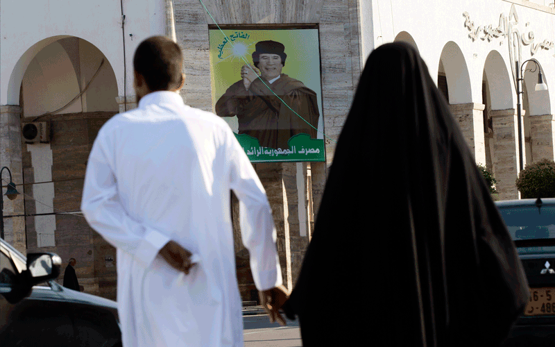 A portrait of Libyan leader Moammar Gaddafi is seen on a building in downtown Tripoli (AP)