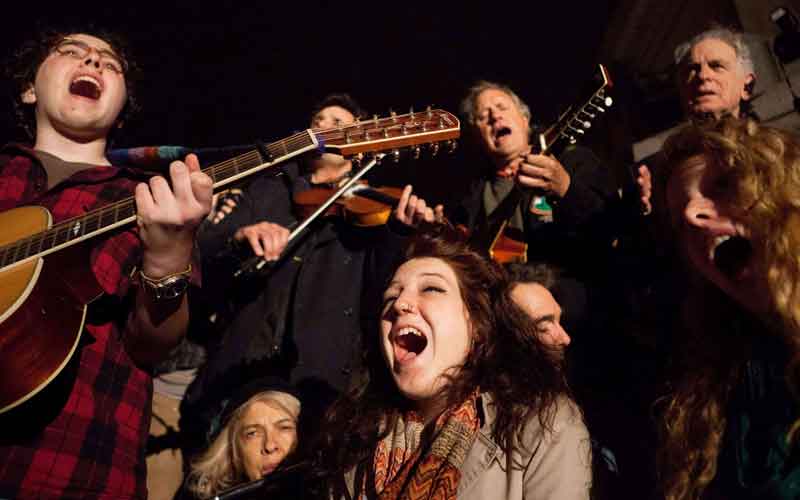 Demonstrators sympathetic to the Occupy Wall Street protests sing at a brief acoustic concert featuring activist musician Pete Seeger in Columbus Circle, on Saturday in New York (AP)